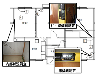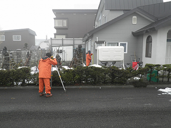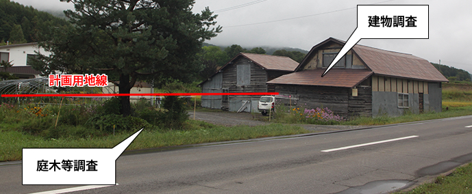 事業用地内の建物や工作物、庭木等の調査(物件調査)を実施し、補償額算定の資料作成を行います。また、公共工事により建物への影響度合いを調査する家屋調査(工損調査)を行います。