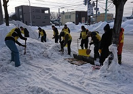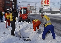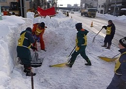 流雪溝投雪ボランティアに参加しました。 33名 国道(4条通)と道道(1条通)に分かれての作業です。 交差点に残った雪は硬く、重機で崩しますが これを一度に入れると詰まるので、細かく砕きながら投入します。 |