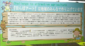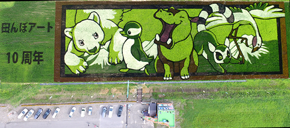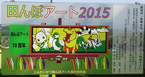 鷹栖町 田んぼアート(JAたいせつ田んぼアート実行委員会) お手伝い(種まき前に測量)をさせていただいた田んぼアート2015が見ごろになりました。 ![]() ![]() (上)現地の看板です。 (下)駐車場(写真左下)の車との対比で、たいへん大きなものであることが分かります。